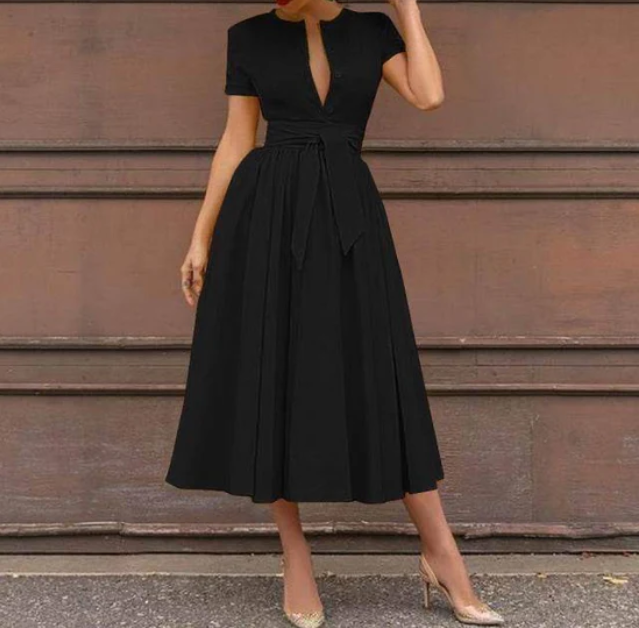 - Waist-defining fabric belt for a flattering, feminine silhouette.